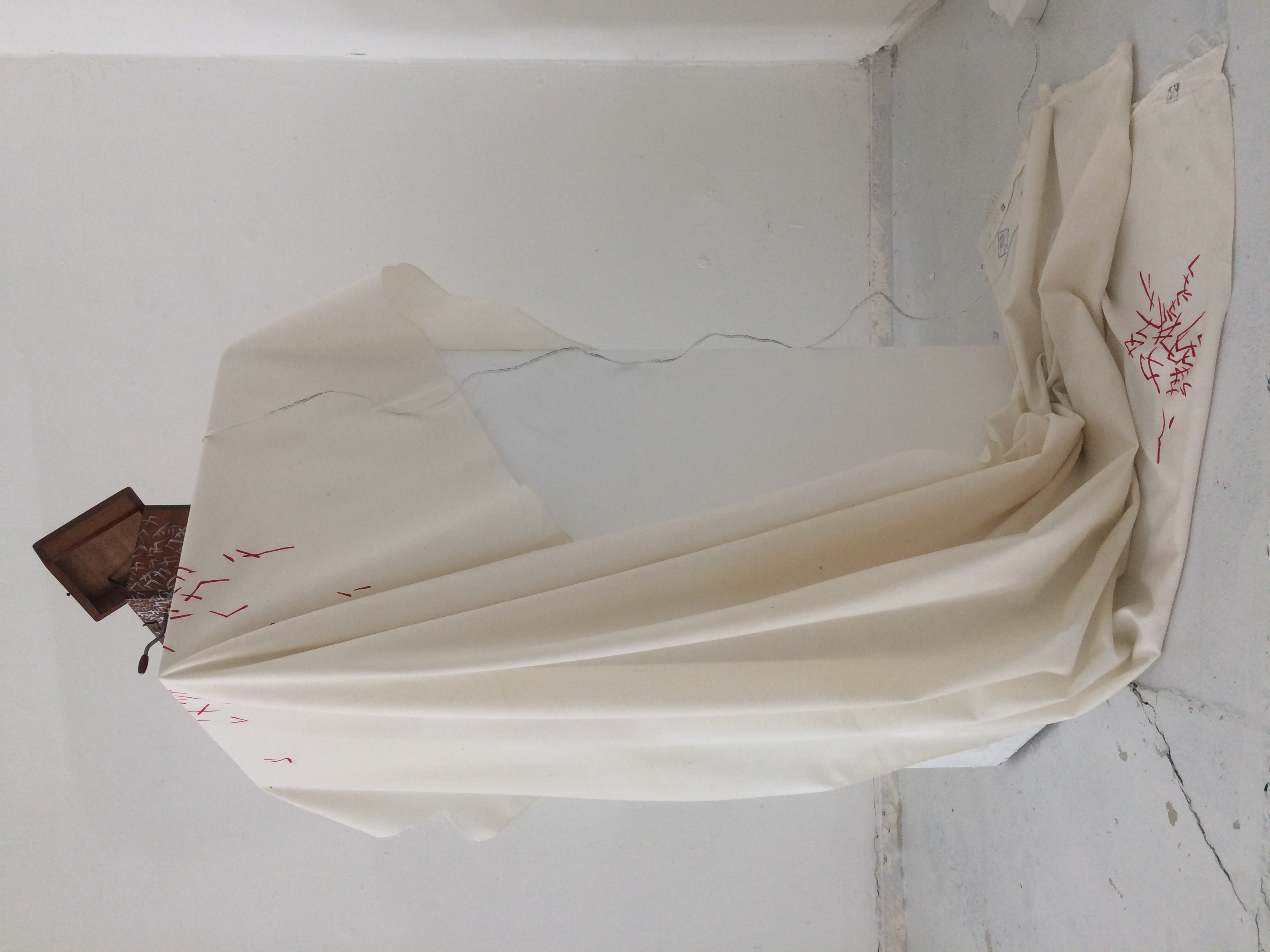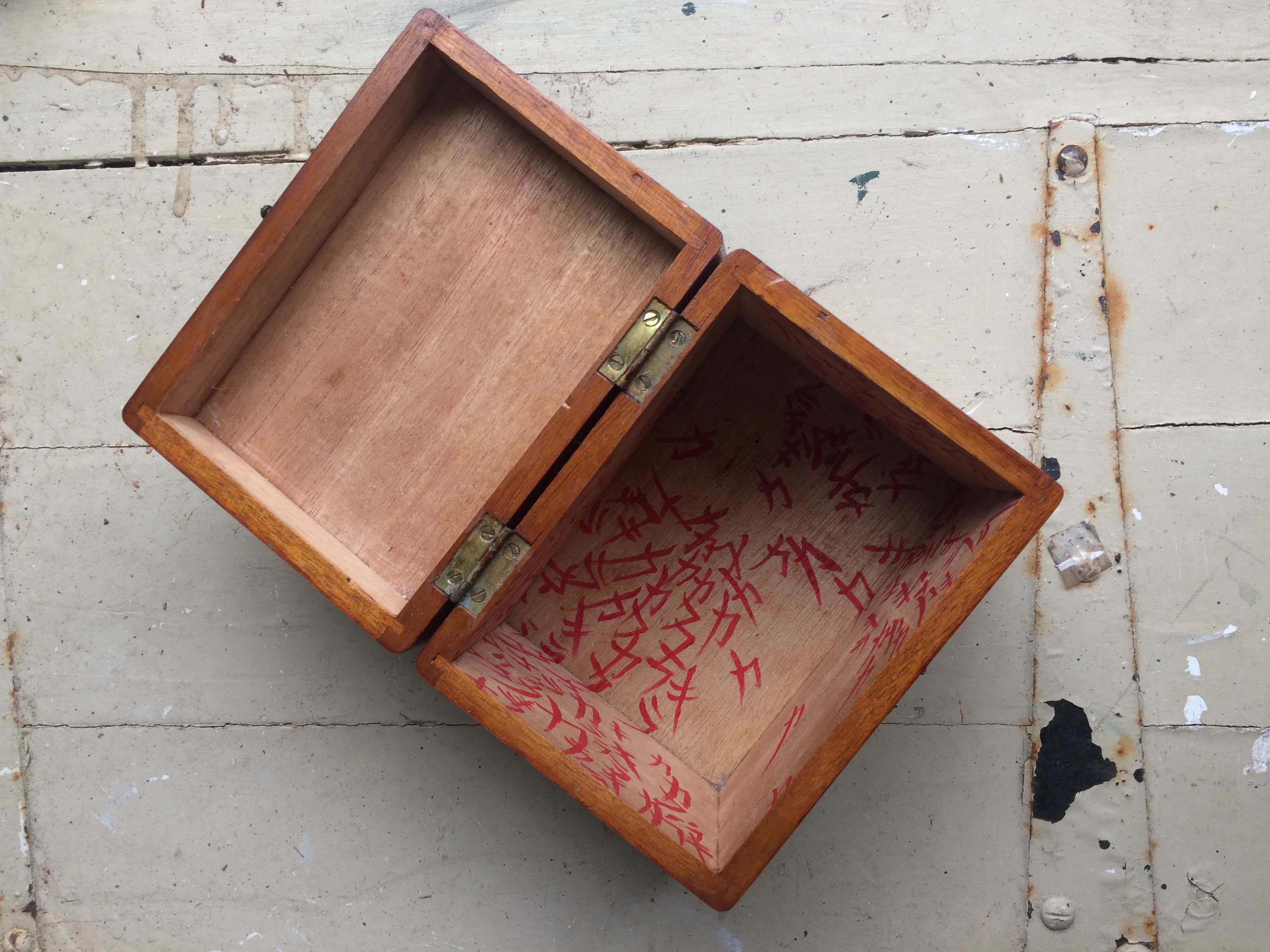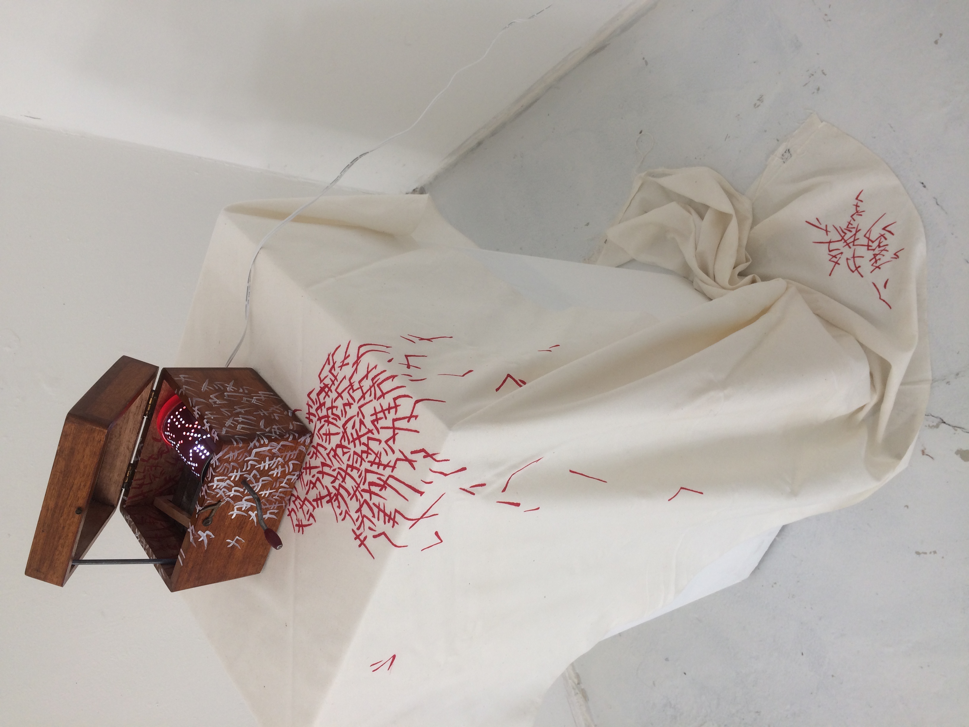 ‘What interested me in Trudi’s work was that it captures sound as if it were physical, in a silent and physically untextured medium. Nevertheless it contains the possibility of sound and texture. It lingers on the senses, taunting, almost daring itself, but hanging back on a perpetual cusp of the real. I wanted to play with this ability of sense stimulants to deviously trade and jest with us. My music box is silent, with light ‘touching’ the skin instead. All the possible sounds that could be expected are absent. Instead they crawl out from inside as letters, spilling and swarming onto the surfaces. Like little devils laughing. The work is made from materials I have stumbled upon, cut apart and repurposed. The letters are my mother tongue.’