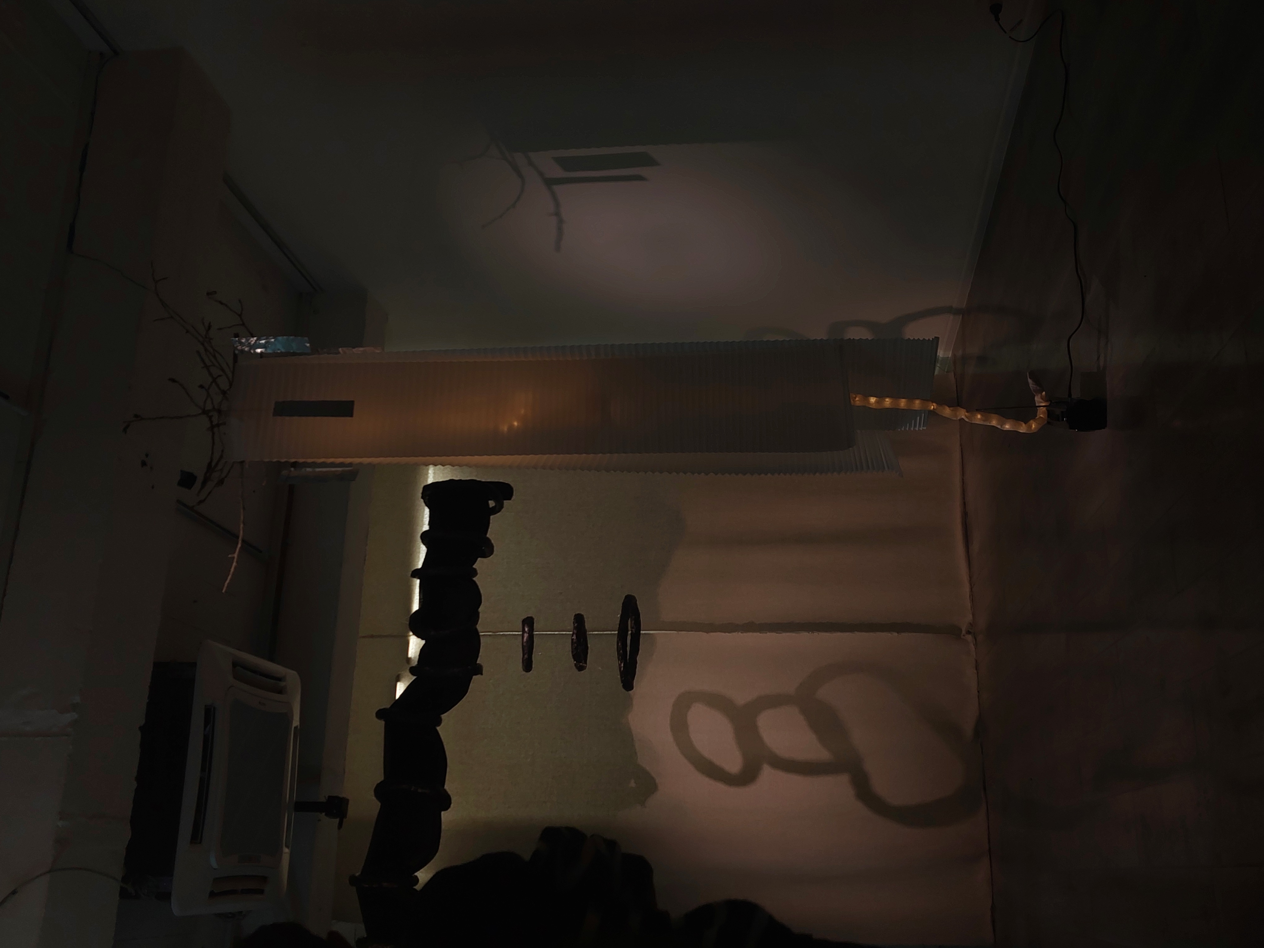 Sticks, rice paper, aluminium, thread, LED lights, cotton, radio.